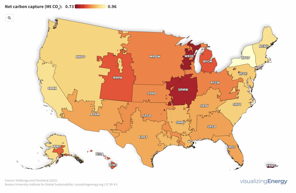 Where in the United States is the net carbon benefit of direct air capture the greatest?
