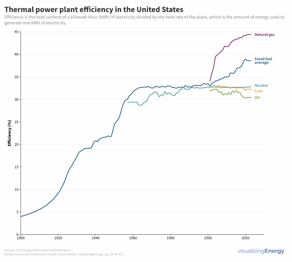 The efficiency of a thermal power plant is the ratio of the electricity output to the energy input, taking into account the heat losses. Over the years, the average efficiency of thermal power plants using fossil fuels in the United States has significantly increased, from 4% in 1900 to 43% in 2023. This improvement is attributed to reducing heat loss in the three main energy conversion processes: fuel combustion, steam generation, and electricity generation.