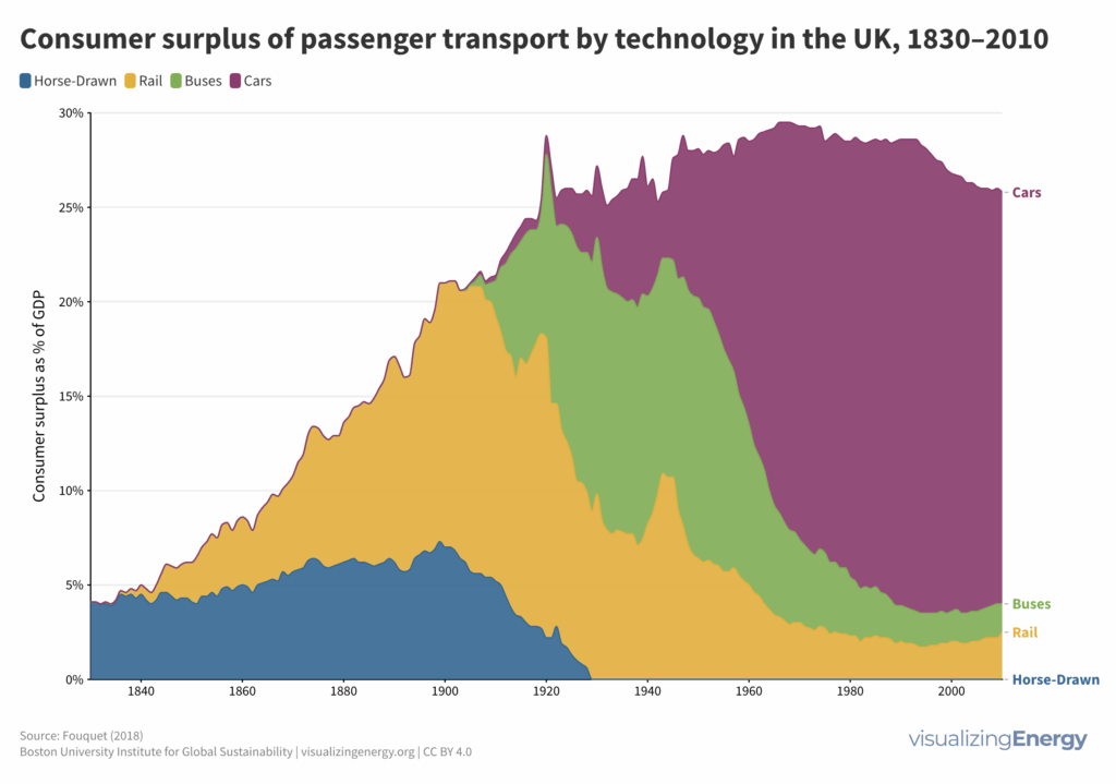 Historic energy transitions, primarily driven by fossil fuels, significantly improved human well-being, measured through consumer surplus. In the UK, transitions from stagecoaches to railways to cars, and from candles to gaslight to electric lighting, substantially increased consumer surplus. However, these benefits diminish as societies reach high well-being levels.