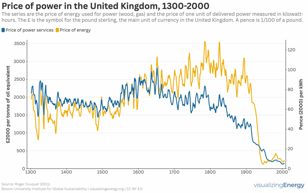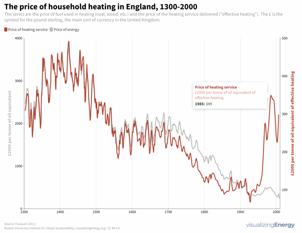 Energy historian Roger Fouquet’s analysis of historic energy transitions in household heating in England from 1300 to 2000 reveals interesting trends. The shift from wood to coal and later to natural gas resulted in fluctuations in fuel prices. Despite the increase in energy costs, improvements in technology and air quality led to a significant decrease in the price of heating services by 2000.