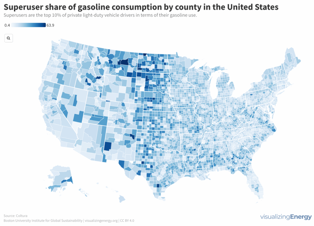 In 2023, US drivers consumed 376 million gallons of gasoline daily, with superusers accounting for 35% of usage. Rural areas have more superusers, spending 10.2% of their income on gasoline. They also tend to drive larger, less fuel-efficient vehicles. Electric vehicle policies targeting superusers could reduce energy burdens and emissions, benefiting low-income households.