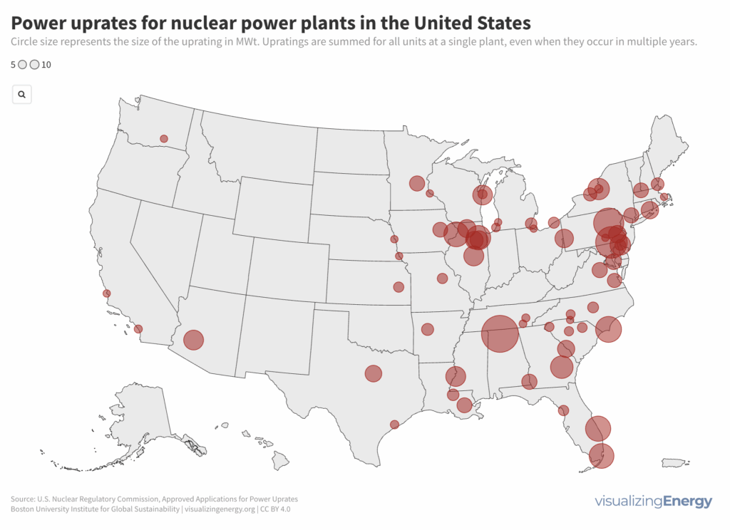 Nuclear power in the US has steadily contributed 19% of electricity since 1990, mainly through uprates. These uprates, approved by the NRC, have boosted capacity by 24,080 MWt or 8030 MWe, equivalent to over 7 new plant units. Most uprates range from 0-5%.