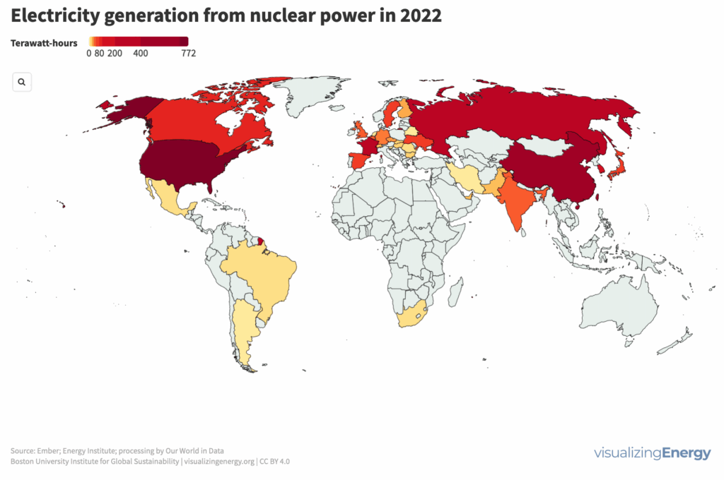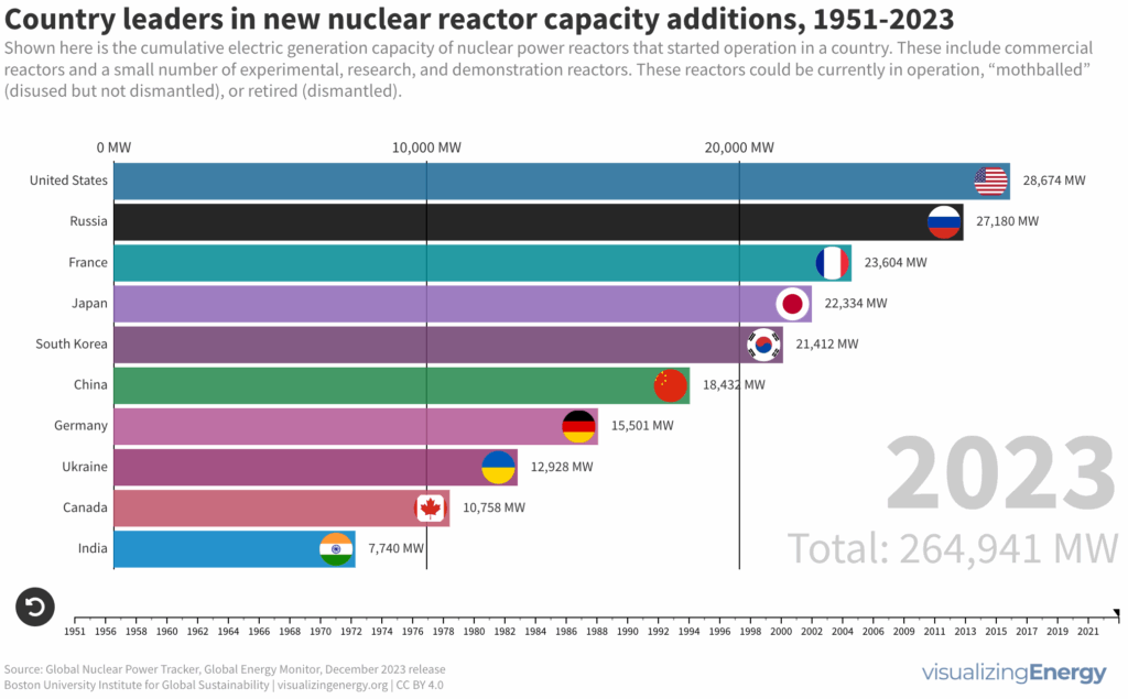 Explore the global history of nuclear reactors from 1951 to 2022. This visualization showcases 626 operational reactors, highlighting the dominance of pressurized light water reactors (PWRs). Different reactor types exhibit geographic patterns, with retired reactors and ongoing upgrades observed in various countries. The average age of reactors in the United States was 41 years in 2021.