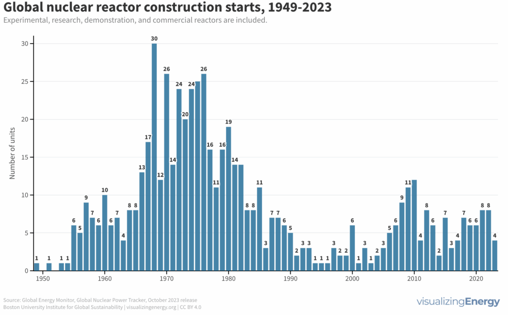 The global nuclear power industry has experienced significant shifts since its post-WWII expansion, with a sharp decline in new reactor starts from the 1990s onwards. More recently, some countries have sought to replace fossil fuels with nuclear power to address emissions and energy security. However, challenges remain in demonstrating the promised benefits of new reactor designs.