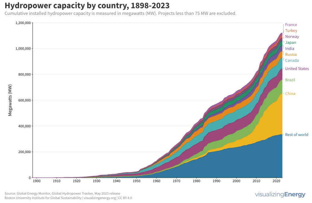 Hydropower, a pioneer in grid-scale electricity generation since the late 19th century, now provides 17% of global electricity, surpassing nuclear, wind, solar, bioenergy, and geothermal combined. While the US and Europe have well-established capacity with limited room for expansion, China, India, Africa, and South America are developing new projects to meet rising electricity demand and reduce greenhouse gas emissions.
