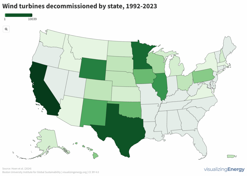 More than 86,000 wind turbines were built in the US from 1981 to early 2024, with over 11,000 decommissioned since 1992. Decommissioning presents waste management challenges, especially with the difficult-to-recycle turbine blades. Research is ongoing for recyclable blades, such as those made from plant material, to address the issue.