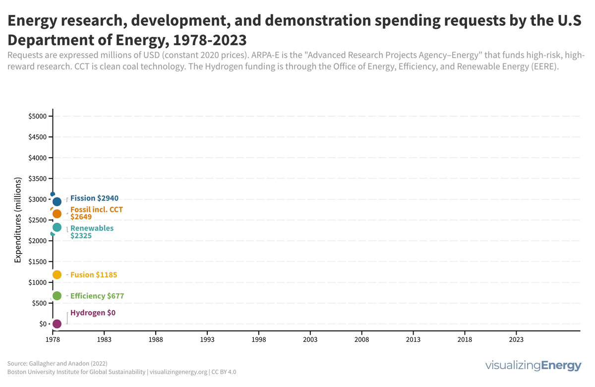 Since the 1940s the United States government has provided substantial financial support for energy-related research, development, and demonstration (RD&D). The Climate Policy Lab at Tufts University maintains a database on RD&D spending by the U.S. Department of Energy (DOE) from 1978 to the present. This is a rich history of how politics, technical and industrial innovation, basic science, national security, environmental concerns, and other forces shape how much DOE spends and where its priorities lie.1