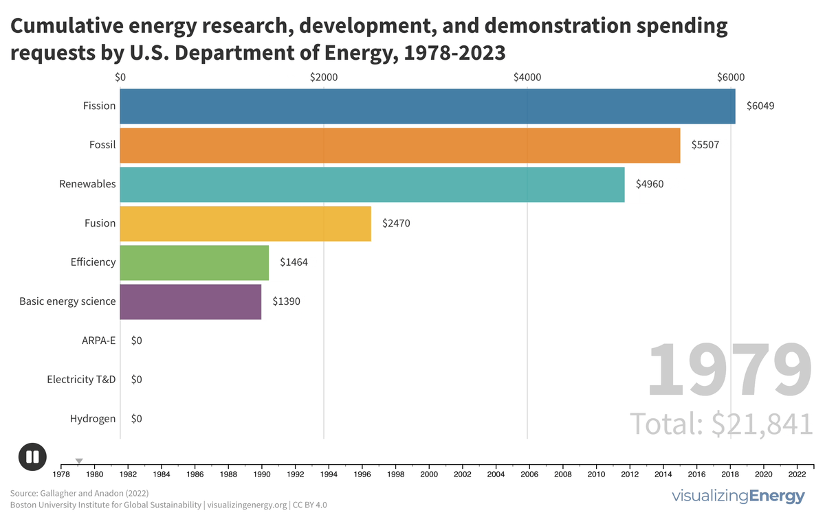 What are the major takeaways? Basic scientific research has received the most support followed by nuclear energy (fission plus fission). The latter is a direct result of making nuclear power a core principle of DOE’s founding strategic mission. Critics might reasonably question the wisdom of the $27 billion invested in fusion given that it has not supplied a single kilowatt hour of electricity, a recent breakthrough notwithstanding.5