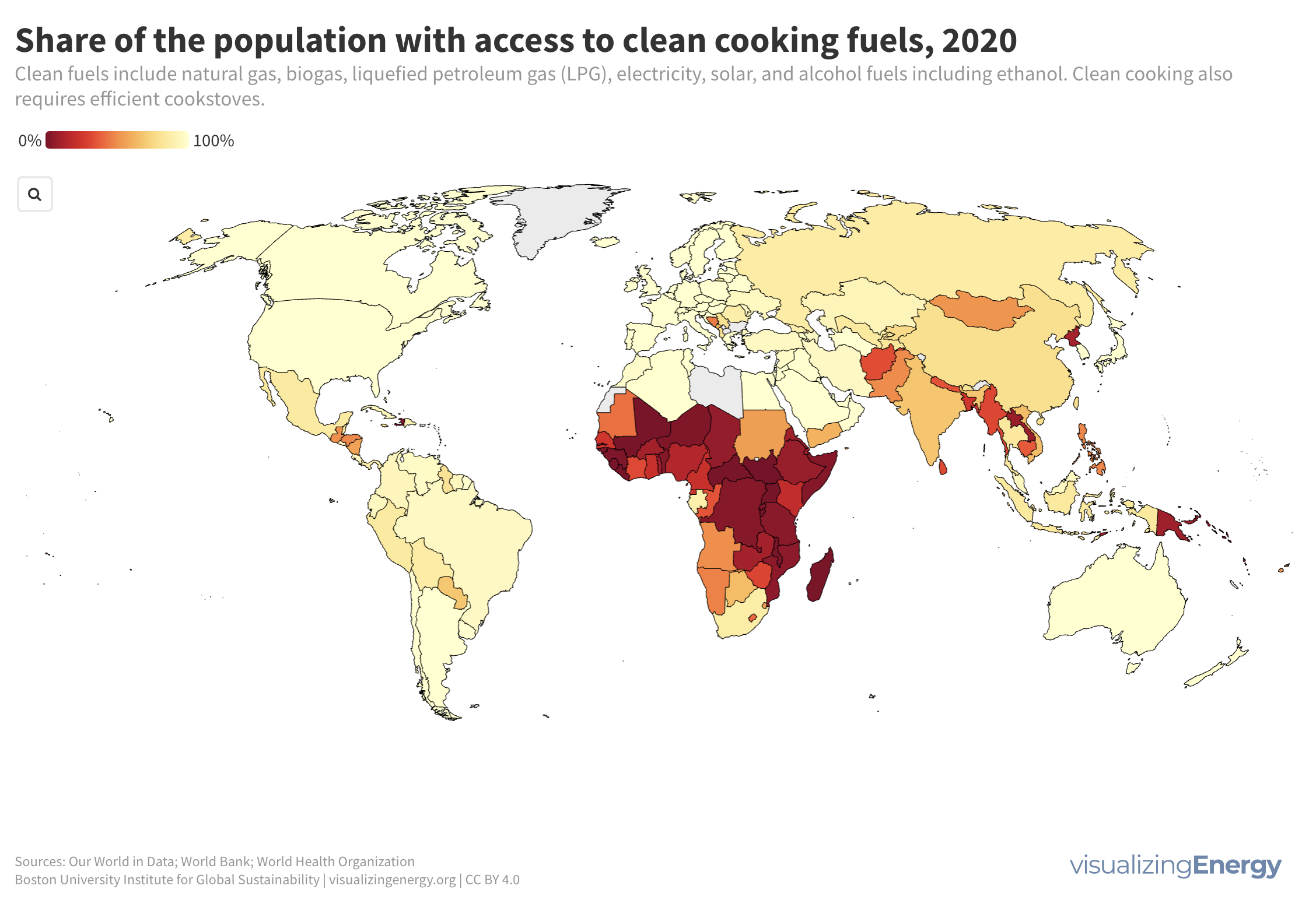 The transition to clean energy brings life-changing benefits like clean cooking services. Clean cooking uses gaseous fuels and electricity, reducing harmful emissions. However, 2.3 billion people still use polluting fuels, leading to millions of deaths annually. Access to clean cooking varies by country income and location. While global access has increased, challenges remain in many countries.